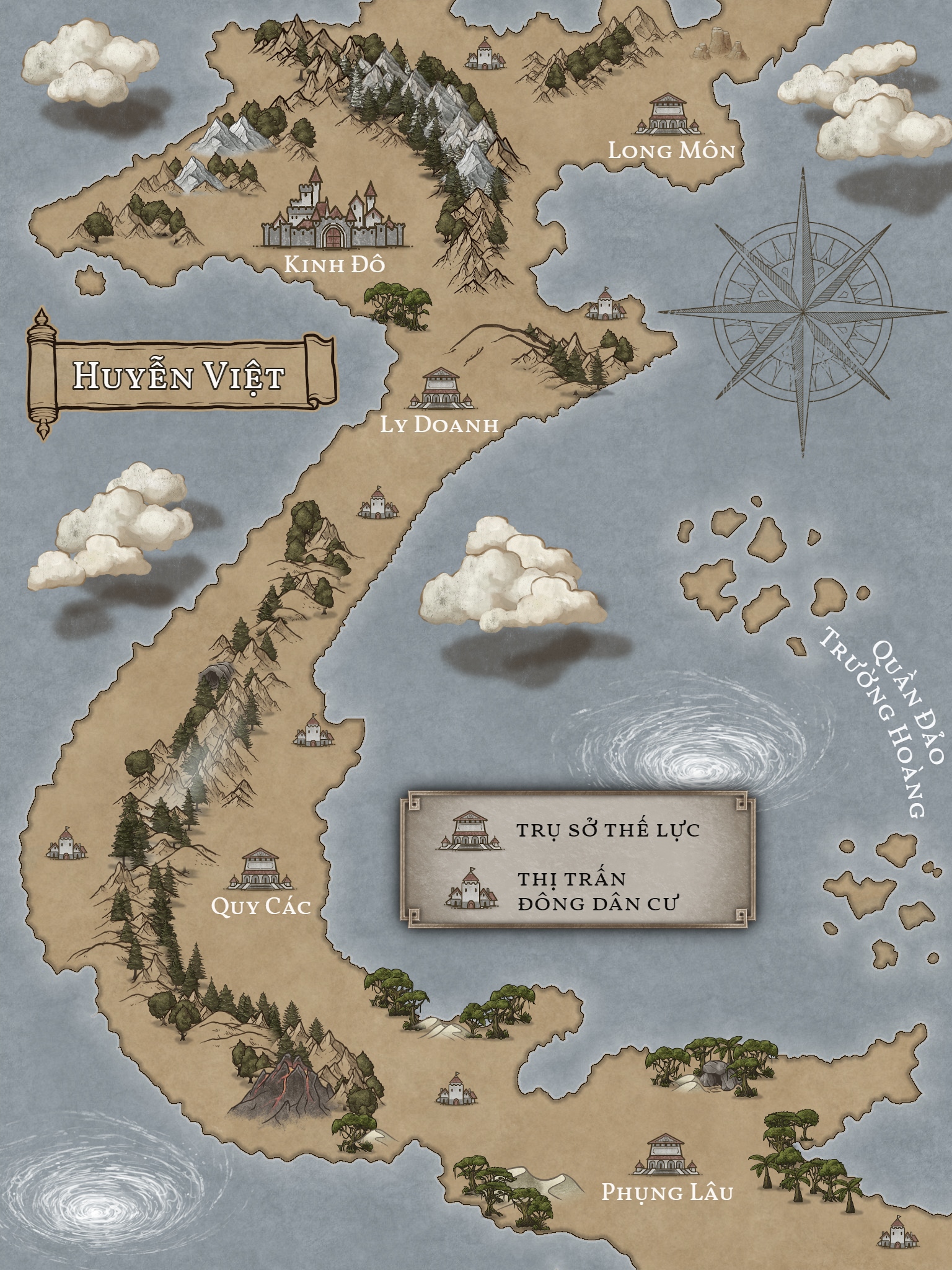 Đây là bản đồ giả tưởng dành cho thế giới Huyễn Việt kỳ đàm, vui lòng bỏ qua các yếu tố địa lý thực tế.